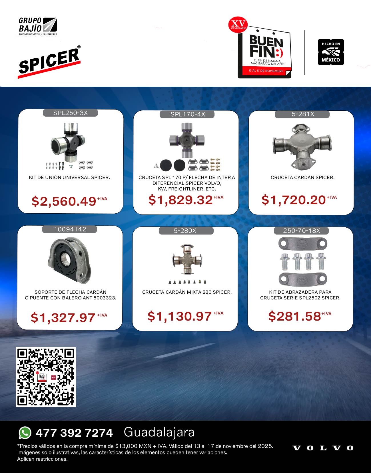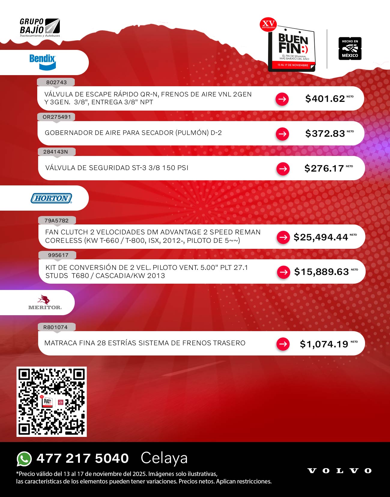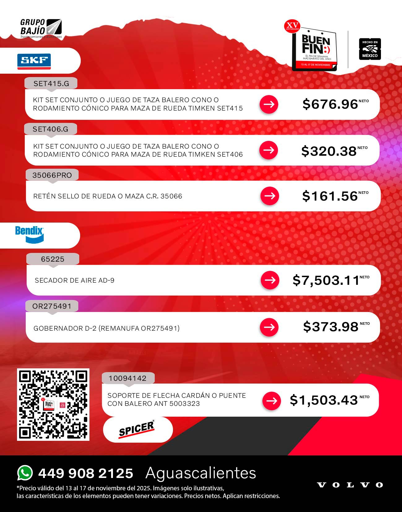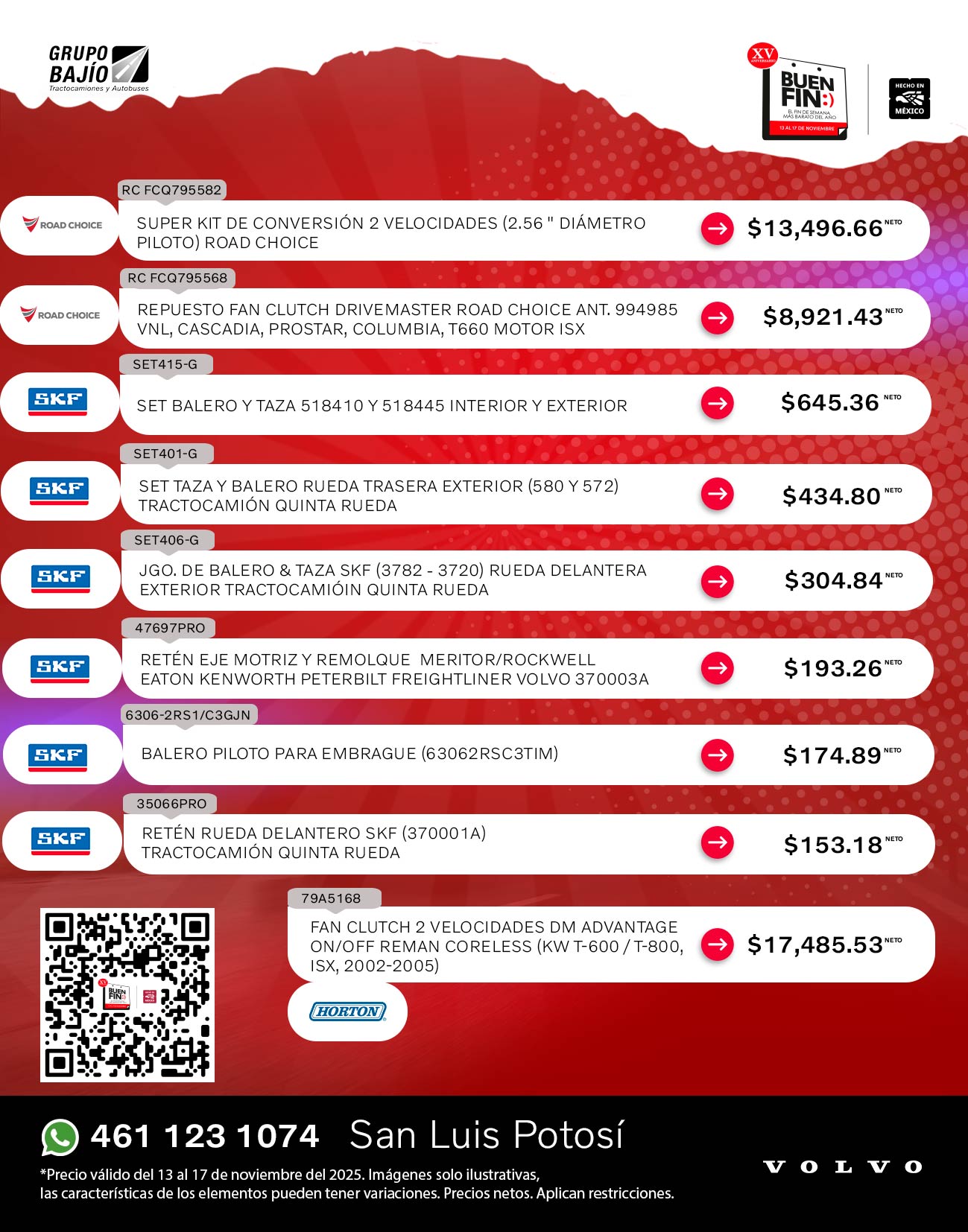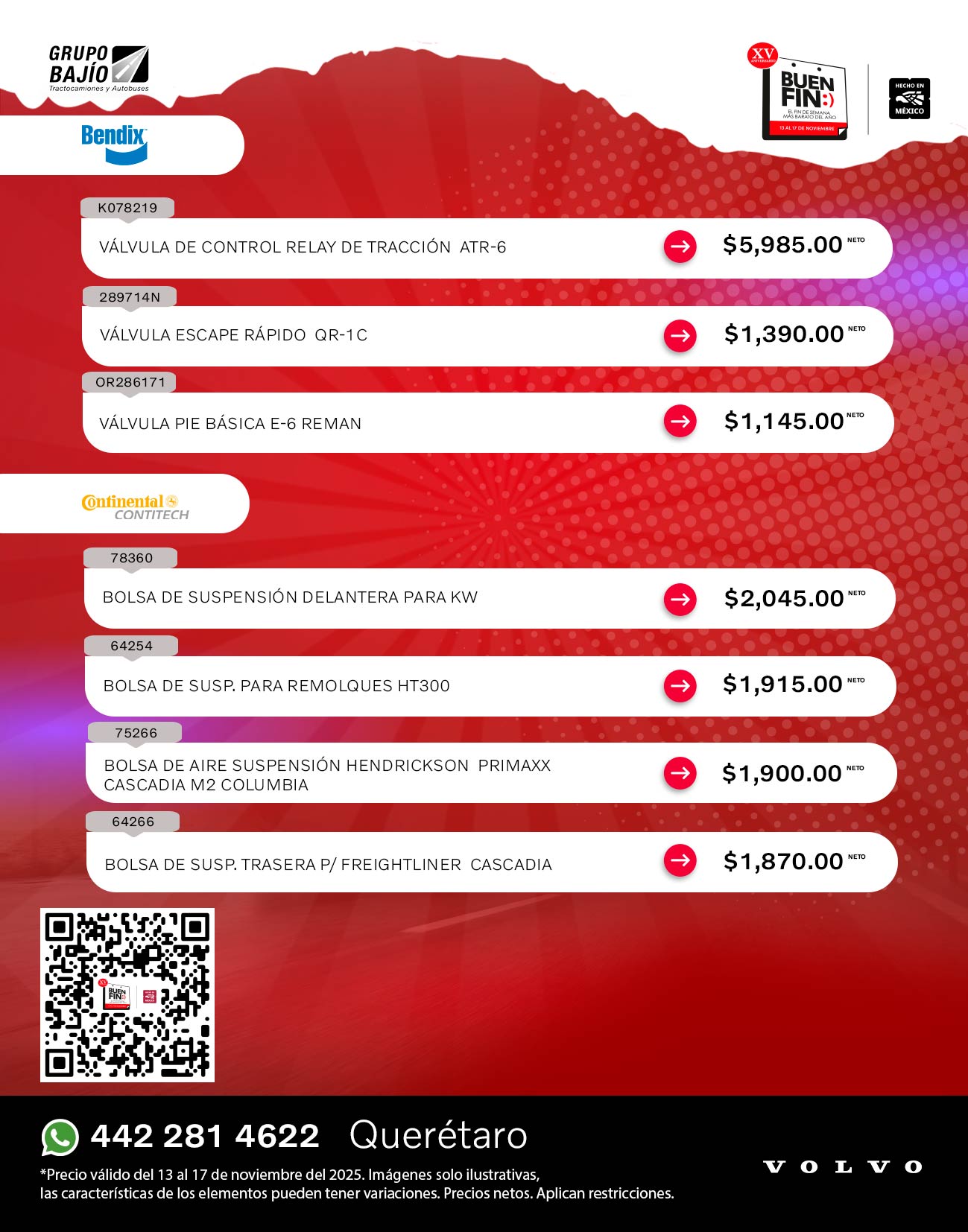 Road Choice, Donaldson, Wurth, Monroe, SKF, Bendix, Horton, Meritor, Delco Remy, Spicer, Hendrickson, Pagid, Aceite Volvo y Continental Contitech