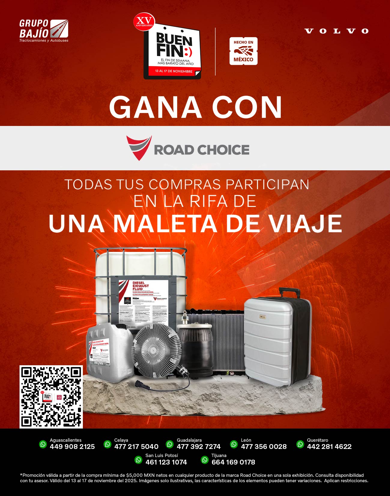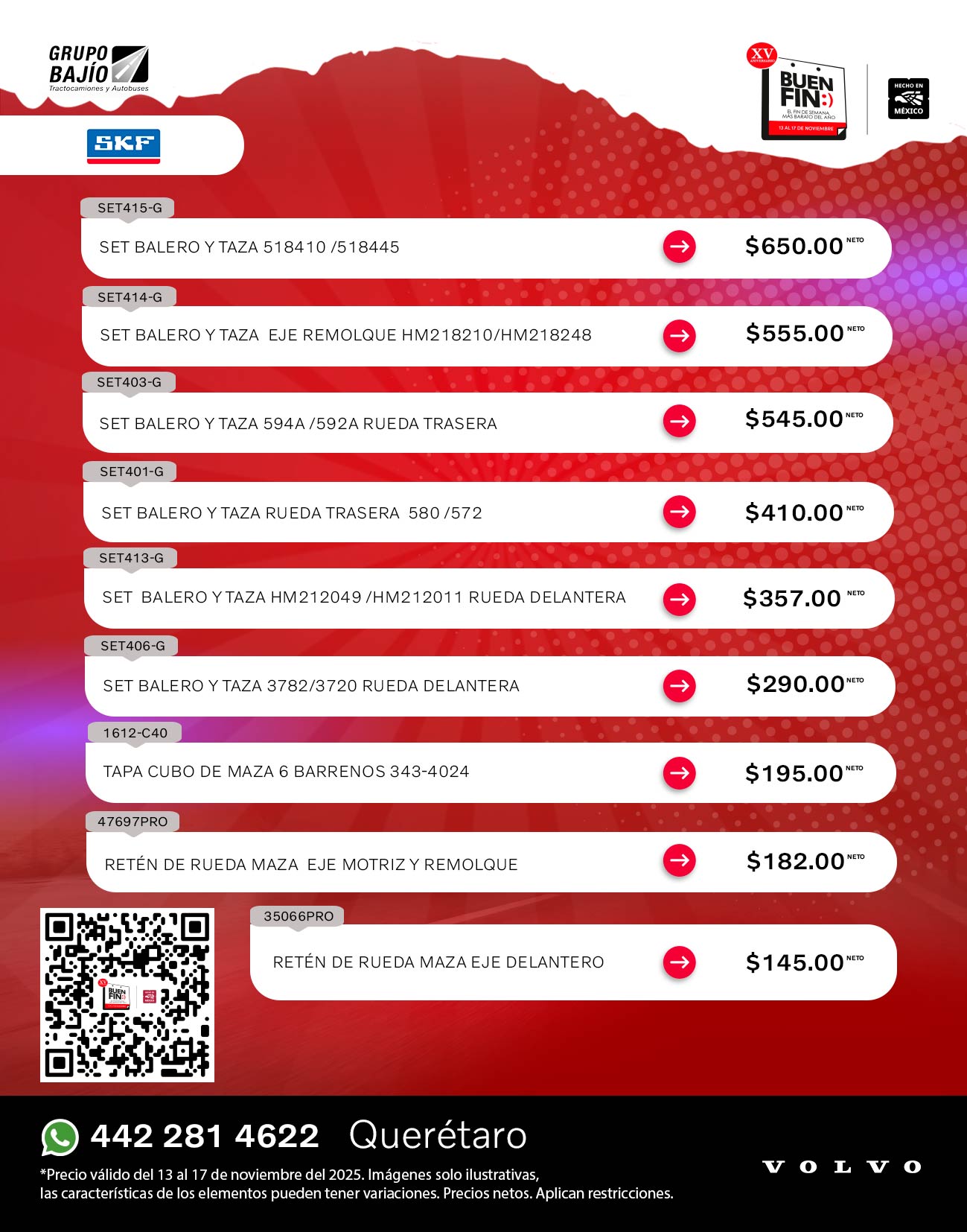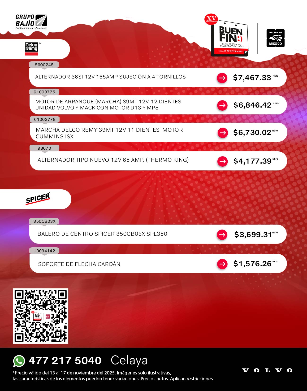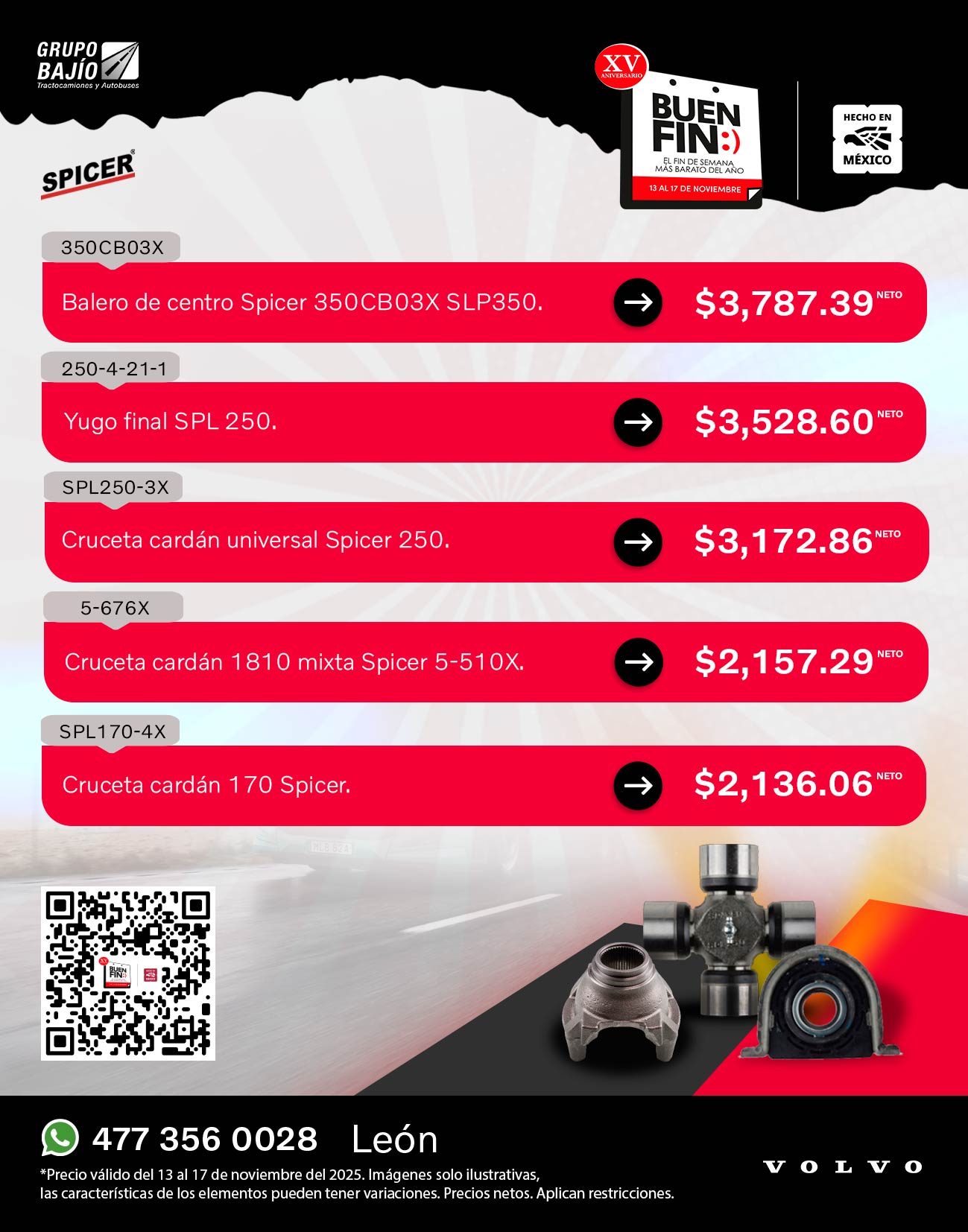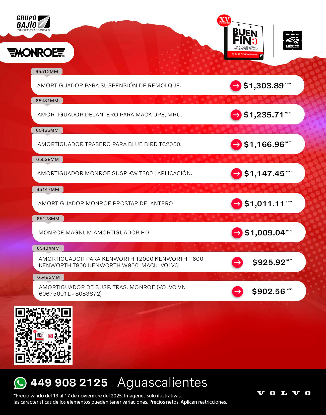 Road Choice, Donaldson, Wurth, Monroe, SKF, Bendix, Horton, Meritor, Delco Remy, Spicer, Hendrickson, Pagid, Aceite Volvo y Continental Contitech